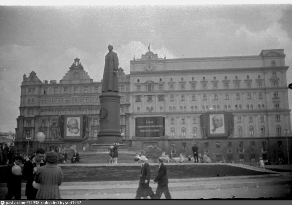 1959 г. Здание КГБ на Лубянке еще не сведено к одному фасаду. Слева — старый доходный дом страхового общества «Россия», справа — новый корпус, который позже вберет в себя изящное дореволюционное здание.