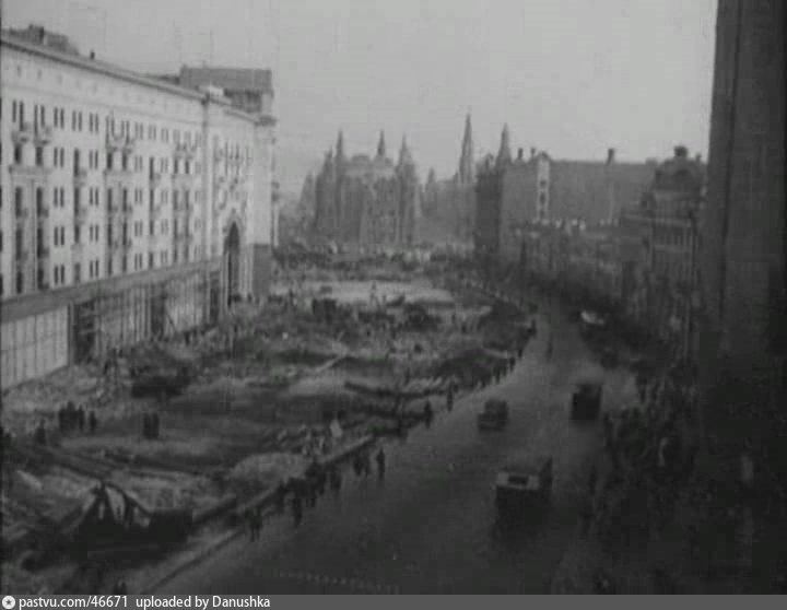 Манежная площадь в 1934 г. Старые кварталы почти снесены, а новые здания гостиницы “Москва” и Госплана (ныне Госдума) еще не завершены.